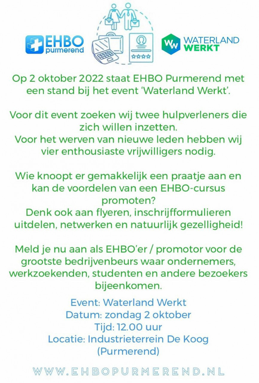 Op 2 oktober 2022 staat EHBO Purmerend met een stand bij het event "Waterland Werkt".